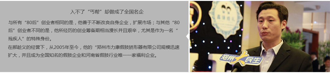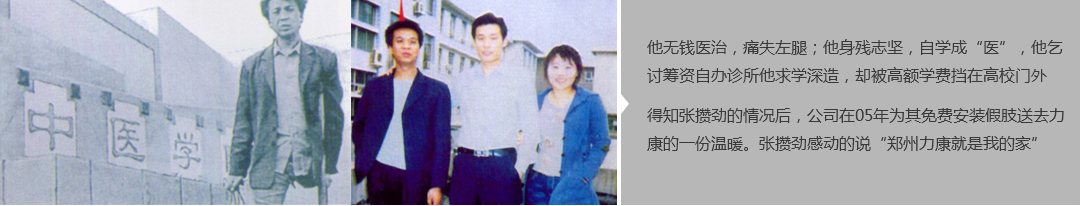 鄭州市力康假肢矯形器有限公司(簡稱力康),是一家專業從事假肢矯形器的設計、研發、制作及裝 配的專業機構。成立于1992年是河南省唯一一家福利企業。力康下設業務部、技術部、住院部、康復 部、售后服務部,并配有現代化的裝配車間和功能齊全的訓練大廳,為殘疾朋友康復訓練提供了可靠 保障??偨浝泶┐骷僦嗄?,有著豐富的臨床經驗和親身體會;多年來,力康已為全國幾十萬名殘疾 朋友安裝上舒適、美觀、耐用的假肢和矯形器具,使他們更大限度地恢復了正常的工作和生活?!爱a 品即人品”的質量理念、先進的技術、實惠的價格、完善的售后服務是力康取勝的法寶……